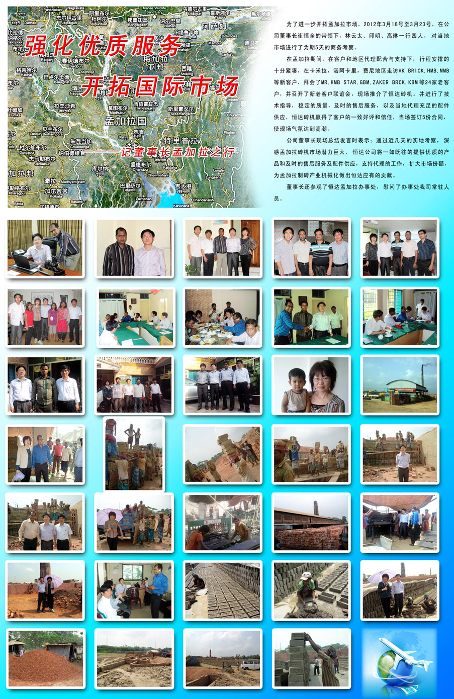 在孟加拉期間,公司得到了當地代理商的鼎力支持,召開(kāi)了新老客戶(hù)聯(lián)誼會(huì ),對當地市場(chǎng)的磚瓦行情進(jìn)行深入交流。當前孟加拉多半還是手工制磚,而且國家已經(jīng)出臺了政策,截至2015年取消手工做磚。這對于公司來(lái)說(shuō)是個(gè)很大的機遇。但同時(shí),競爭也是激烈的,各個(gè)磚機廠(chǎng)紛紛涌入孟加拉市場(chǎng),加強對當地市場(chǎng)的開(kāi)發(fā),可以說(shuō)機遇與挑戰并存的,這就要求公司要嚴抓產(chǎn)品質(zhì)量,加強售后服務(wù),爭取使我們的機器遍布孟加拉市場(chǎng)。