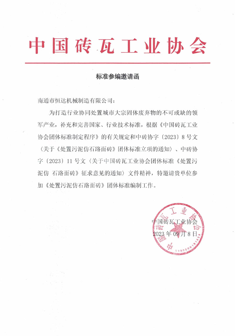 行業(yè)要健康發(fā)展,標準必須先行。再此背景下,2023年10月21-22日,在中國杭州,中國磚瓦協(xié)會(huì )及時(shí)的組織了行業(yè)骨干企業(yè),群策群力,制定高質(zhì)量標準。南通市恒達機械制造有限公司董事長(cháng)崔恒全和技術(shù)總工于銀龍受邀請參加,為標注的制定貢獻恒達力量。